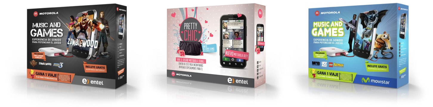 Desarrollo de gráfica para packaging de celulares Motorola en colaboración con diversas compañías; Los detalles de las cajas destacan accesorios, apps y tecnologias de cada modelo.