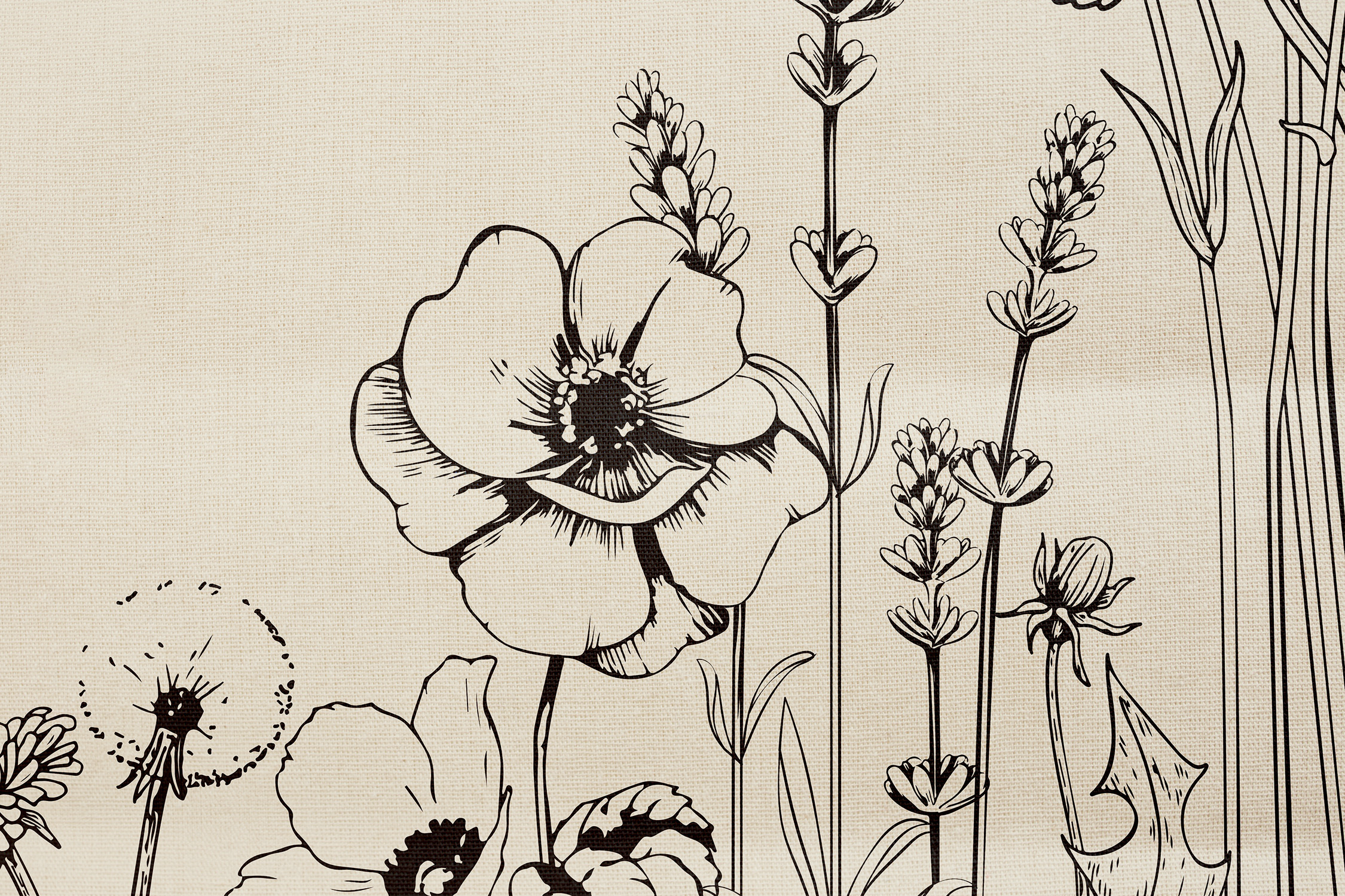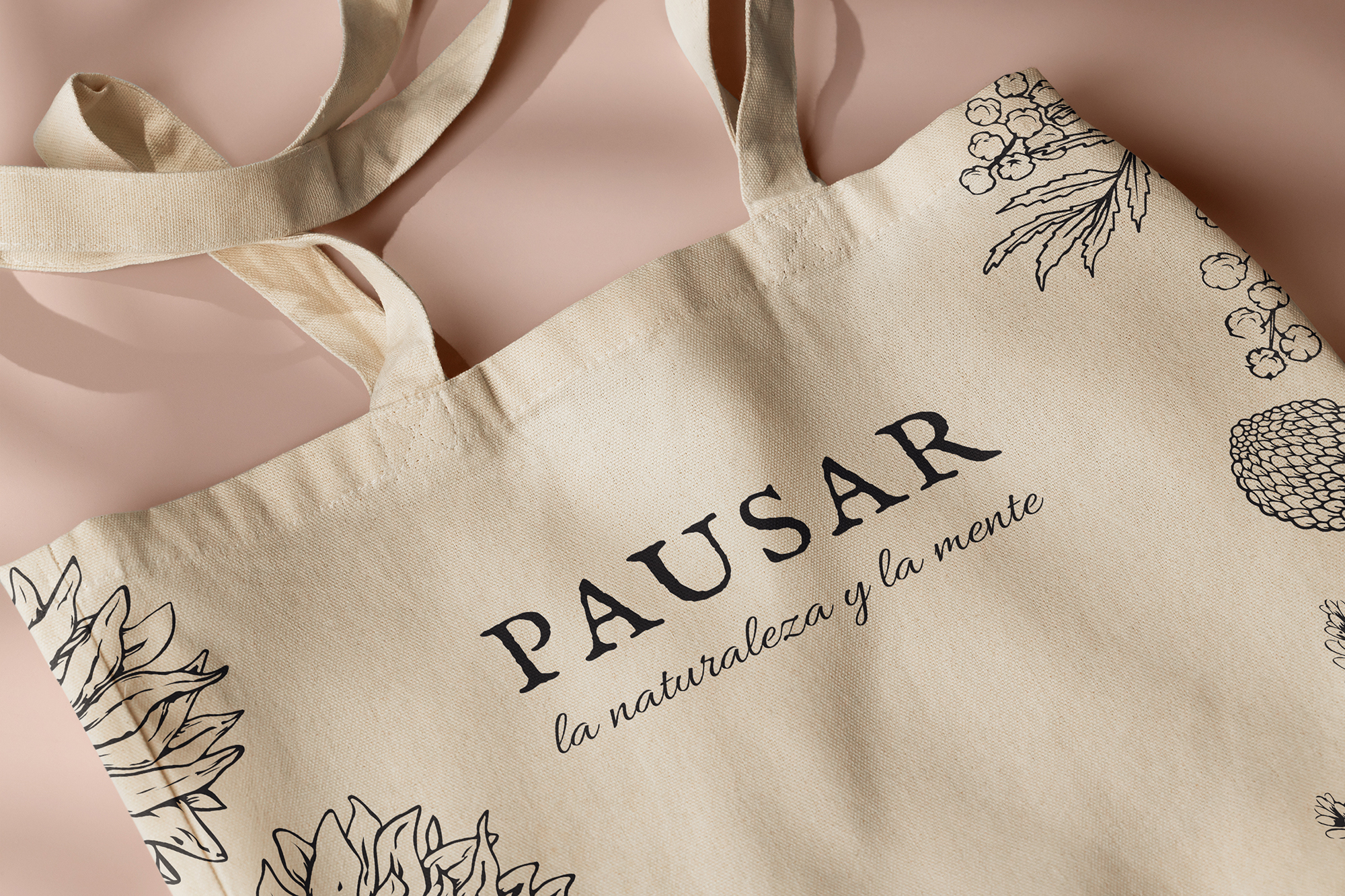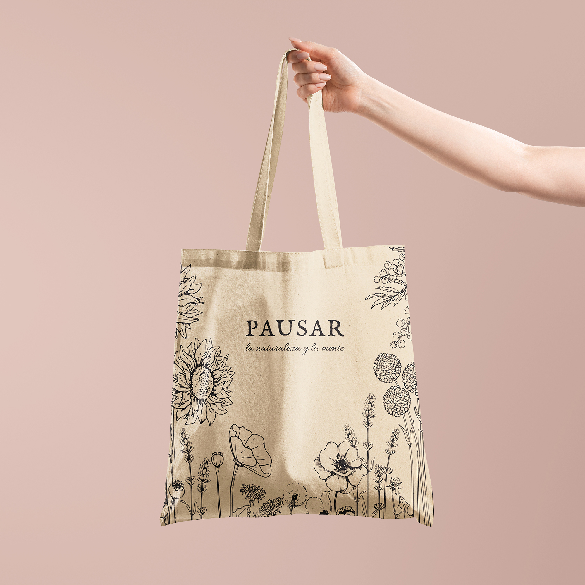 Diseño e ilustración floral para bolsas y packaging de Pausar, arte moderno con flores prensadas que llama a pausar la naturaleza y la mente en objetos decorativos.