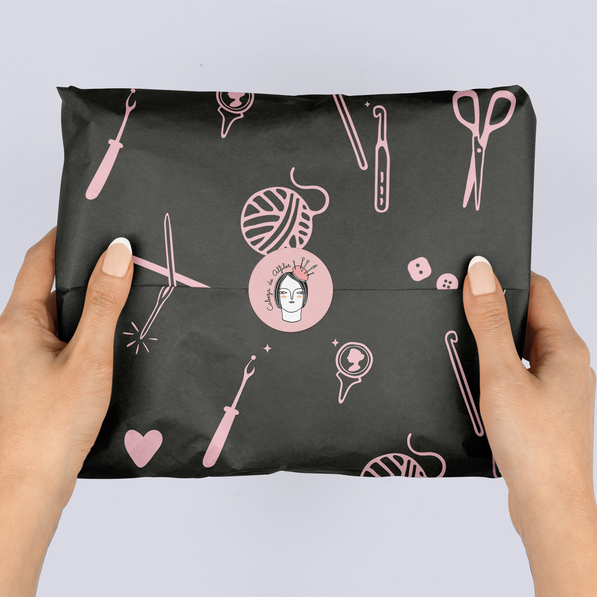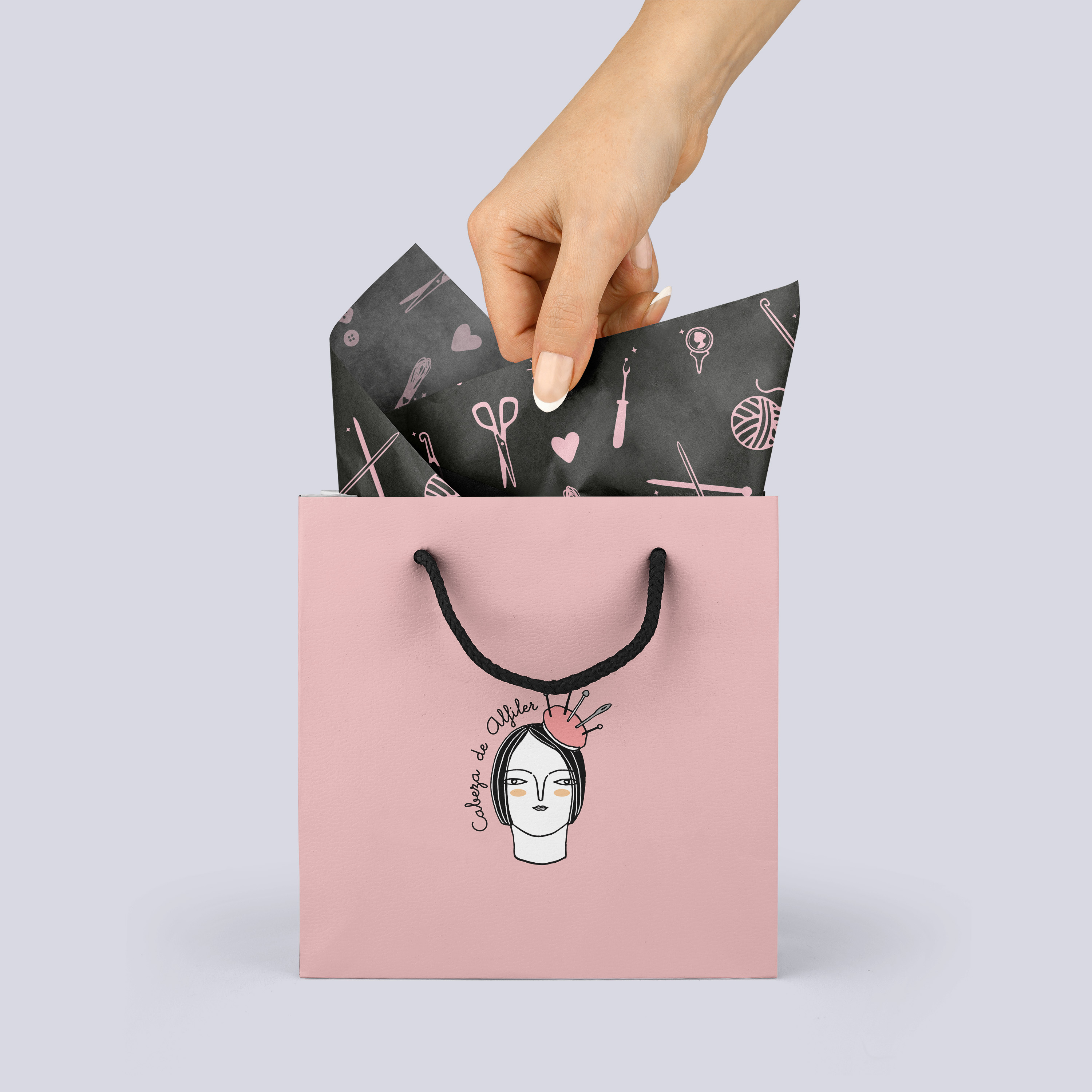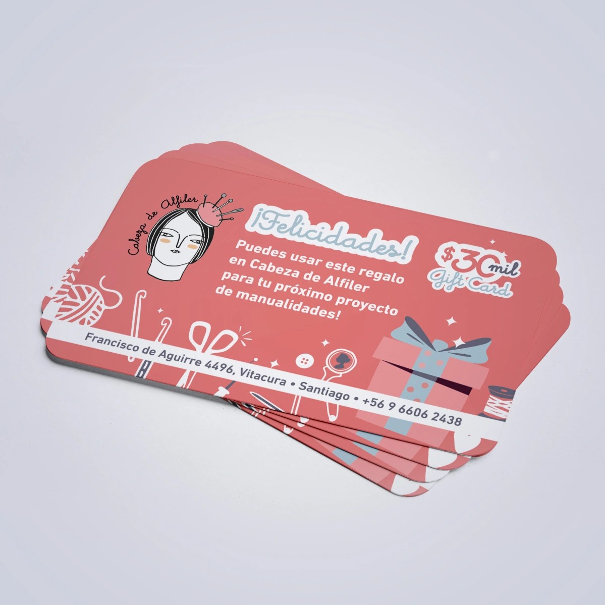 Diseño de gift cards y patrón de packaging para Cabeza de Alfiler, tienda boutique de manualidades. Los más lindos materiales para realizar labores como tejido, bordado, crochet, y kits que te permitirán hacer entretenidos proyectos.