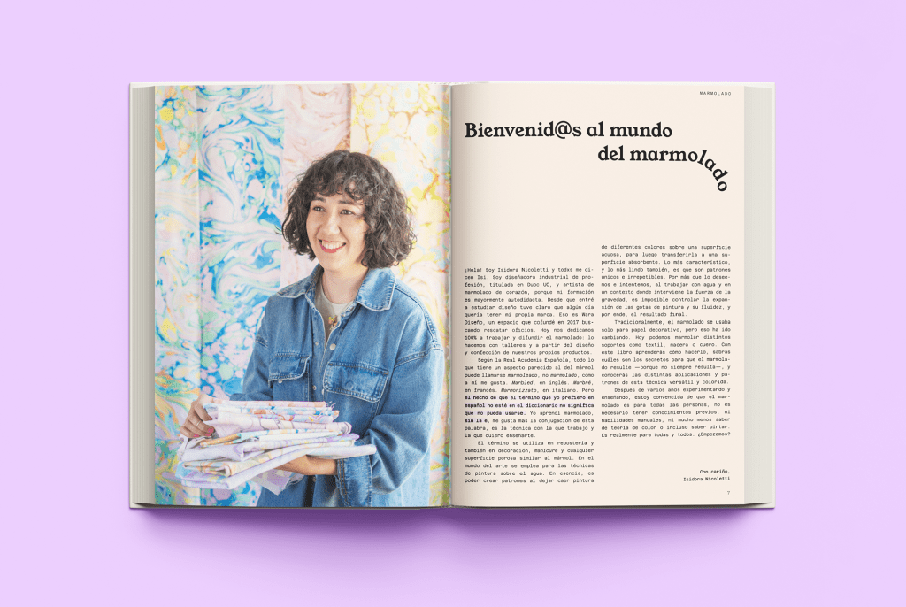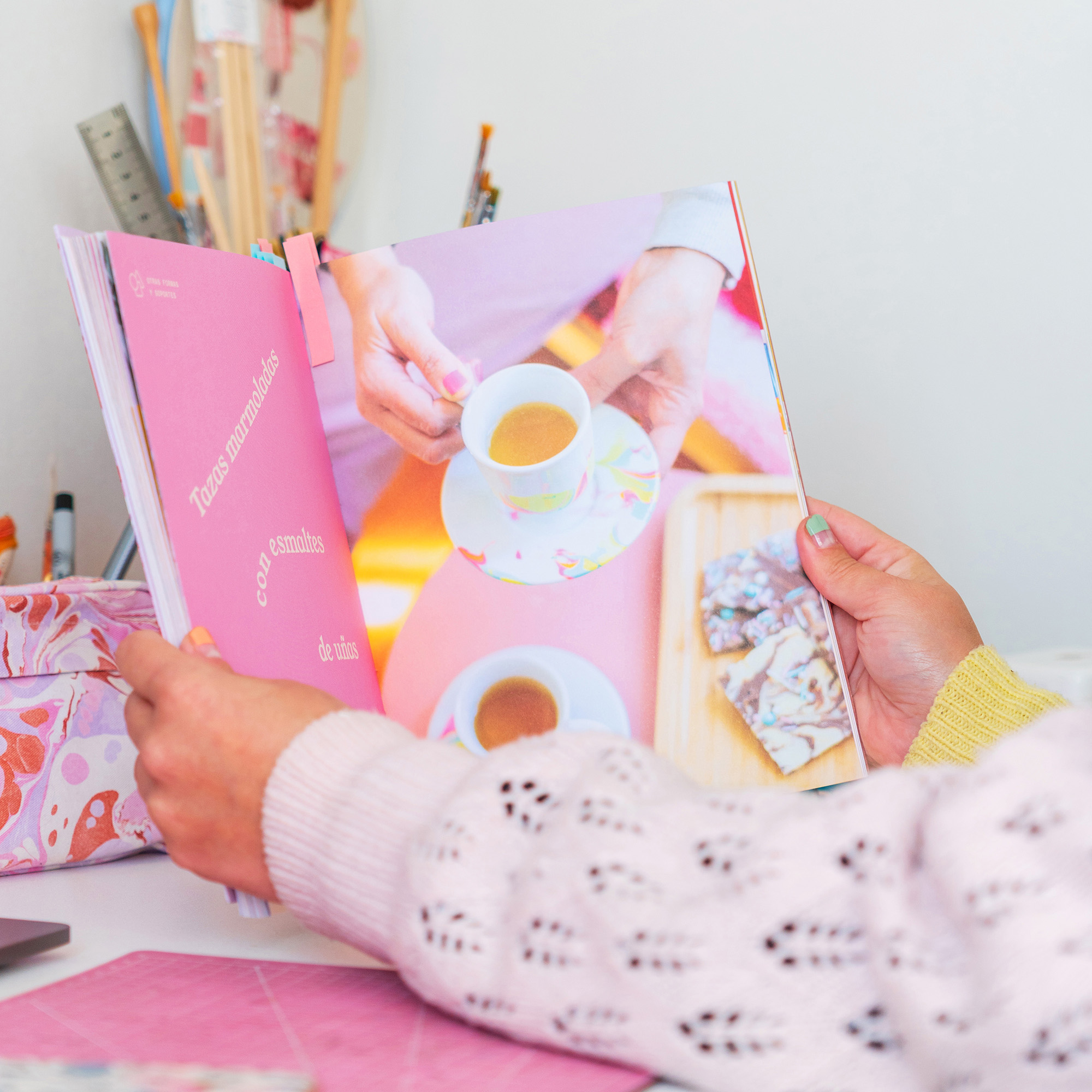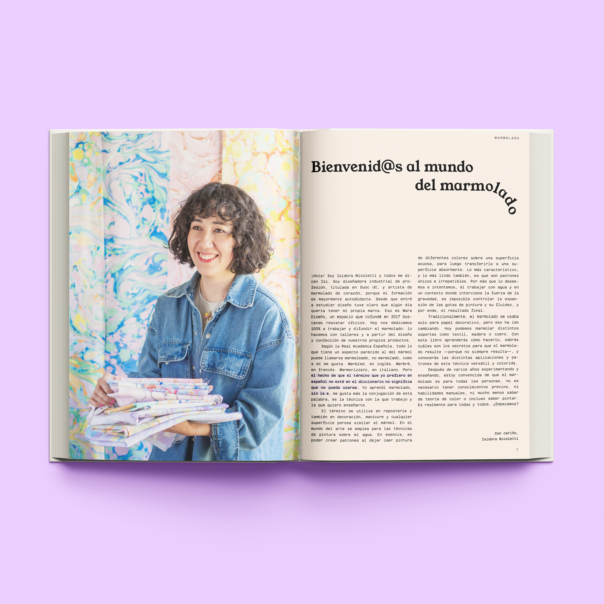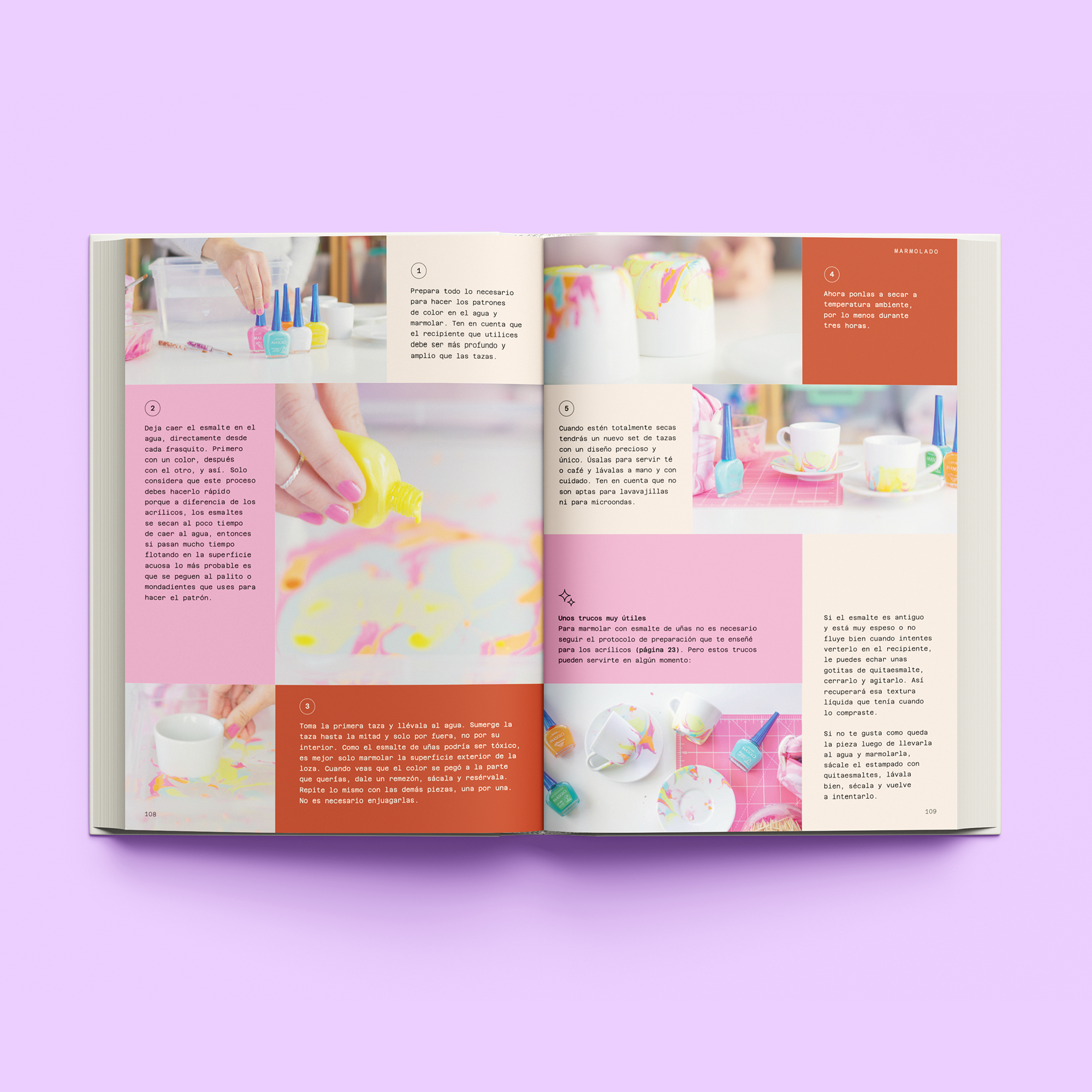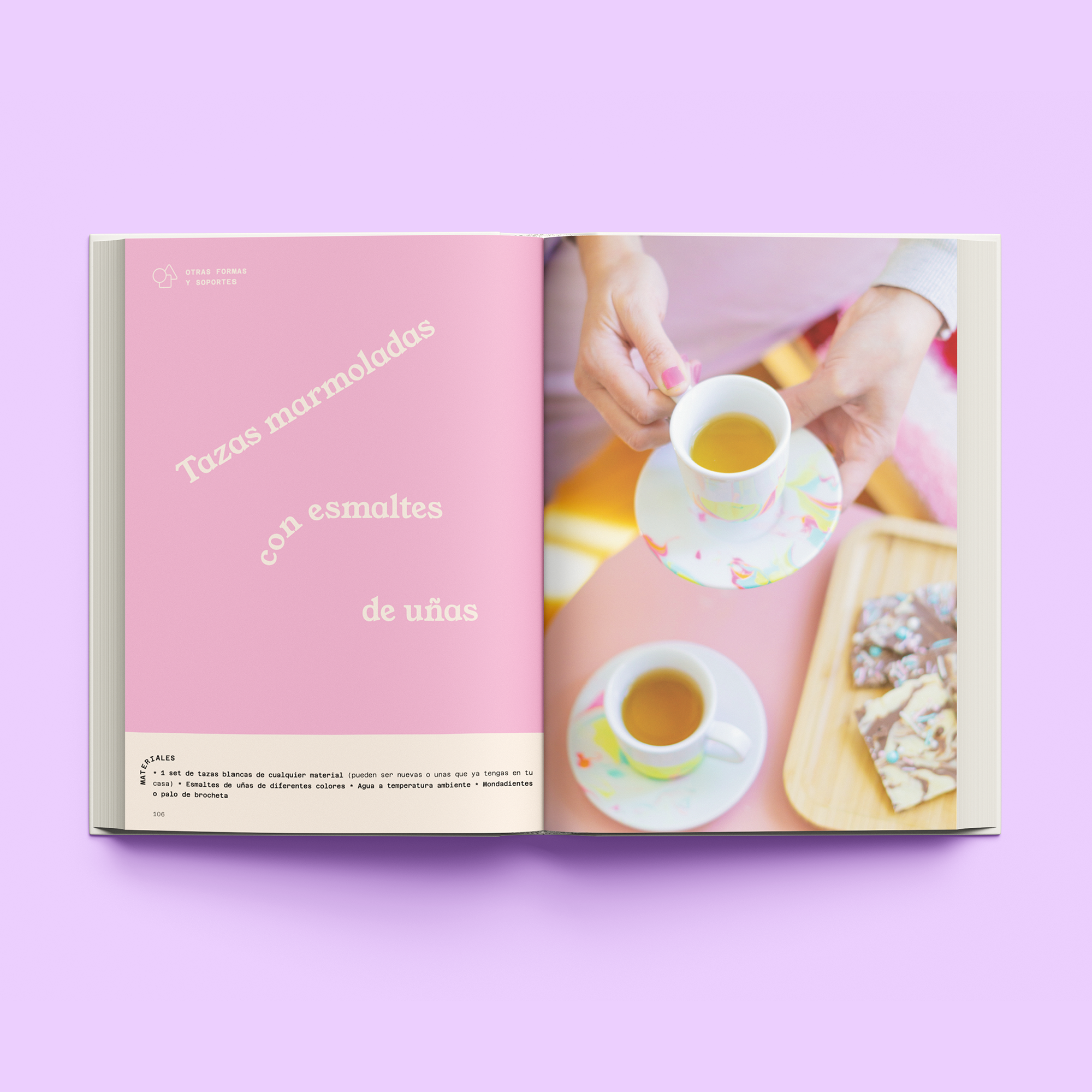 «Con este libro podrás iniciarte en el mundo del marmolado —o reforzar lo que ya sabes— por medio de tips, tutoriales y contenidos. Podrás aprender sobre el origen de la técnica, cómo aplicarla paso a paso y cuáles son los materiales y herramientas que necesitarás para empezar. Además, la autora ha preparado 20 tutoriales para que crees tus propios diseños, y ha dejado registro de sus mejores secretos, trucos y tips para que cada proyecto se transforme en una explosión fascinante de color»