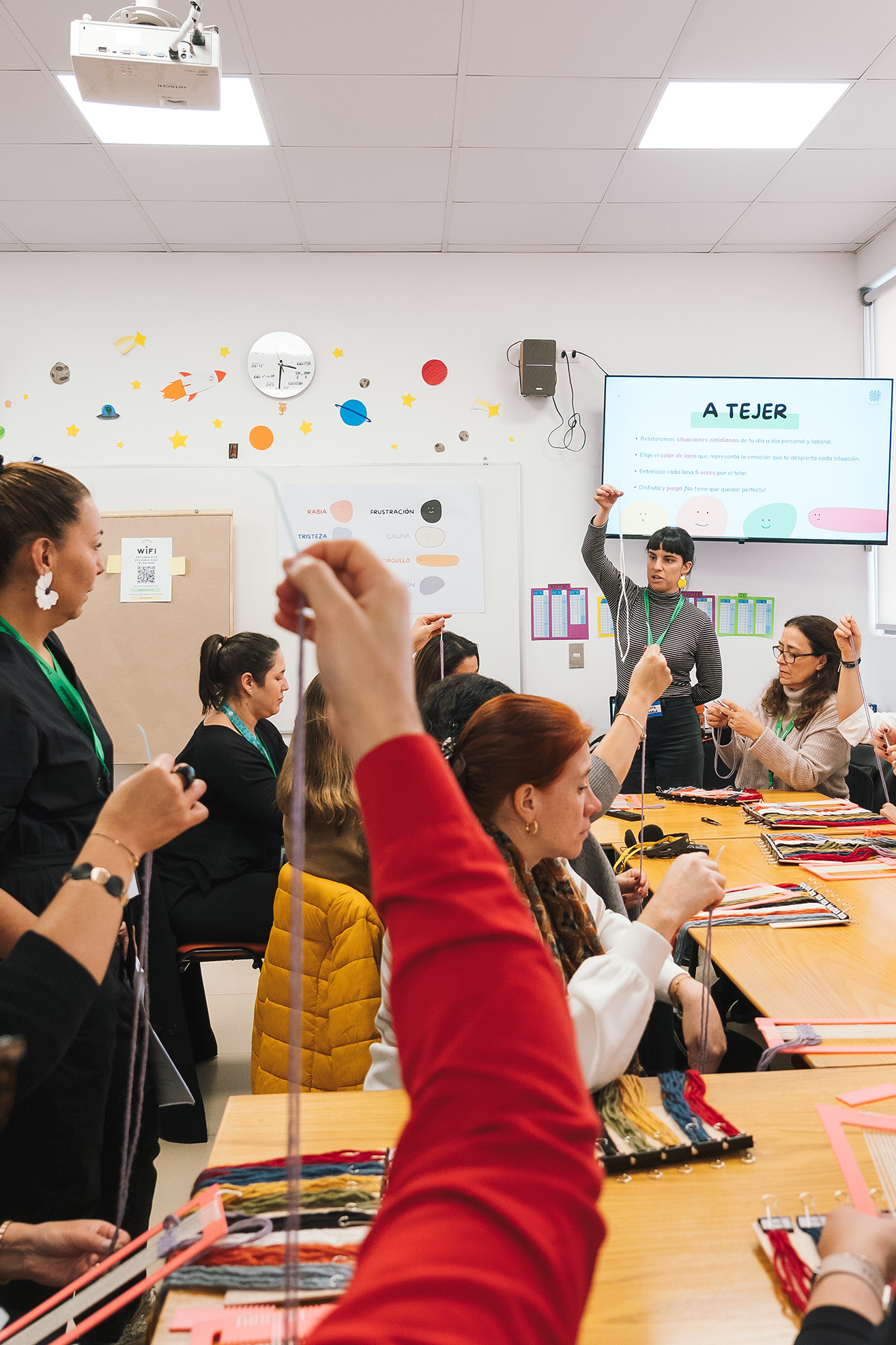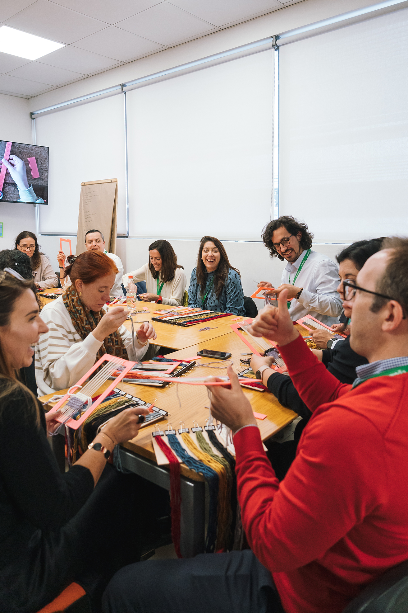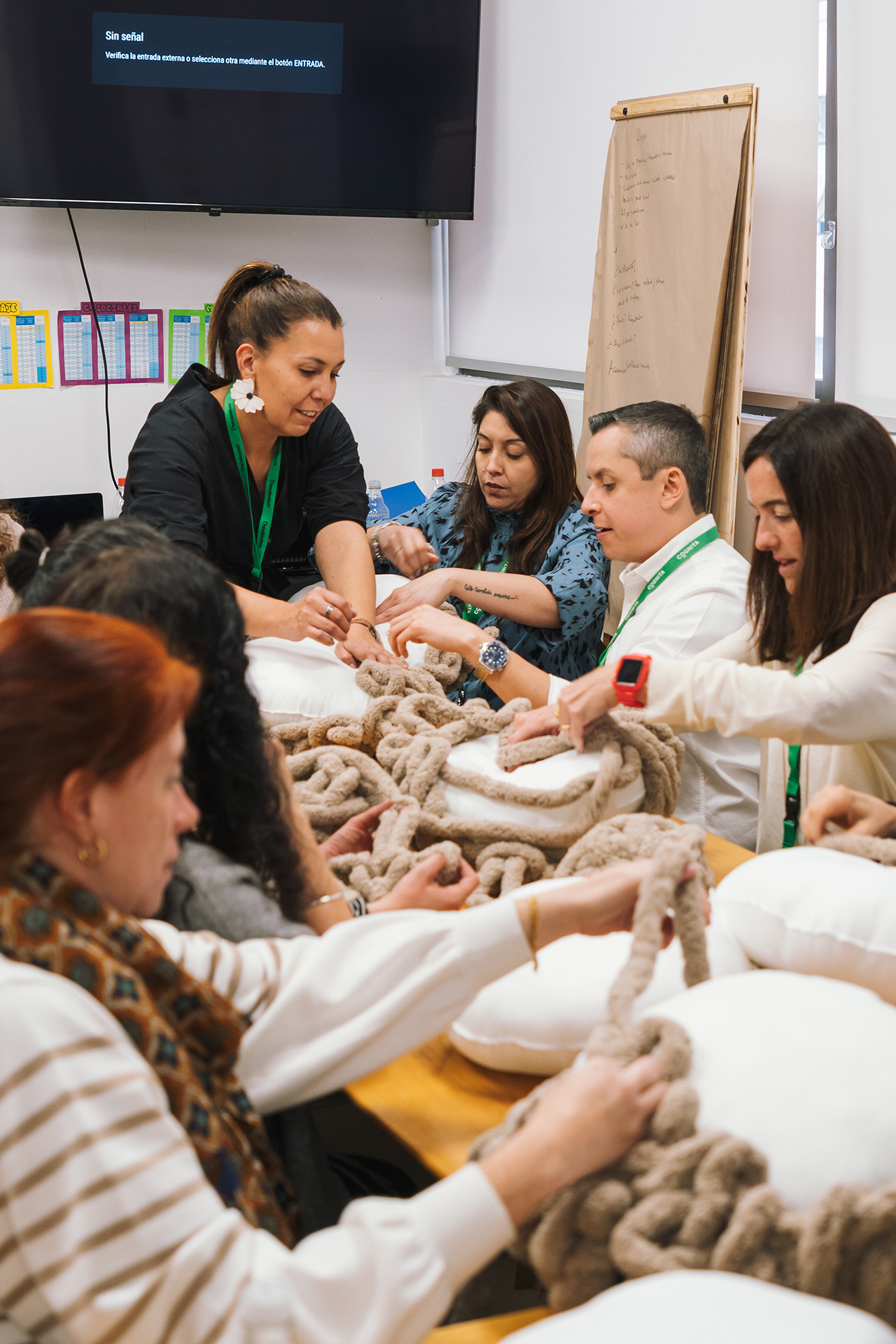 Estas intervenciones están centradas en la gestión emocional, la comunicación consciente y el fortalecimiento de vínculos. A través de dinámicas corporales, conversaciones guiadas y actividades creativas con textiles, las intervenciones abren espacios de pausa, escucha y conexión, invitando a las personas a relacionarse de manera más humana y colaborativa dentro de sus organizaciones.
