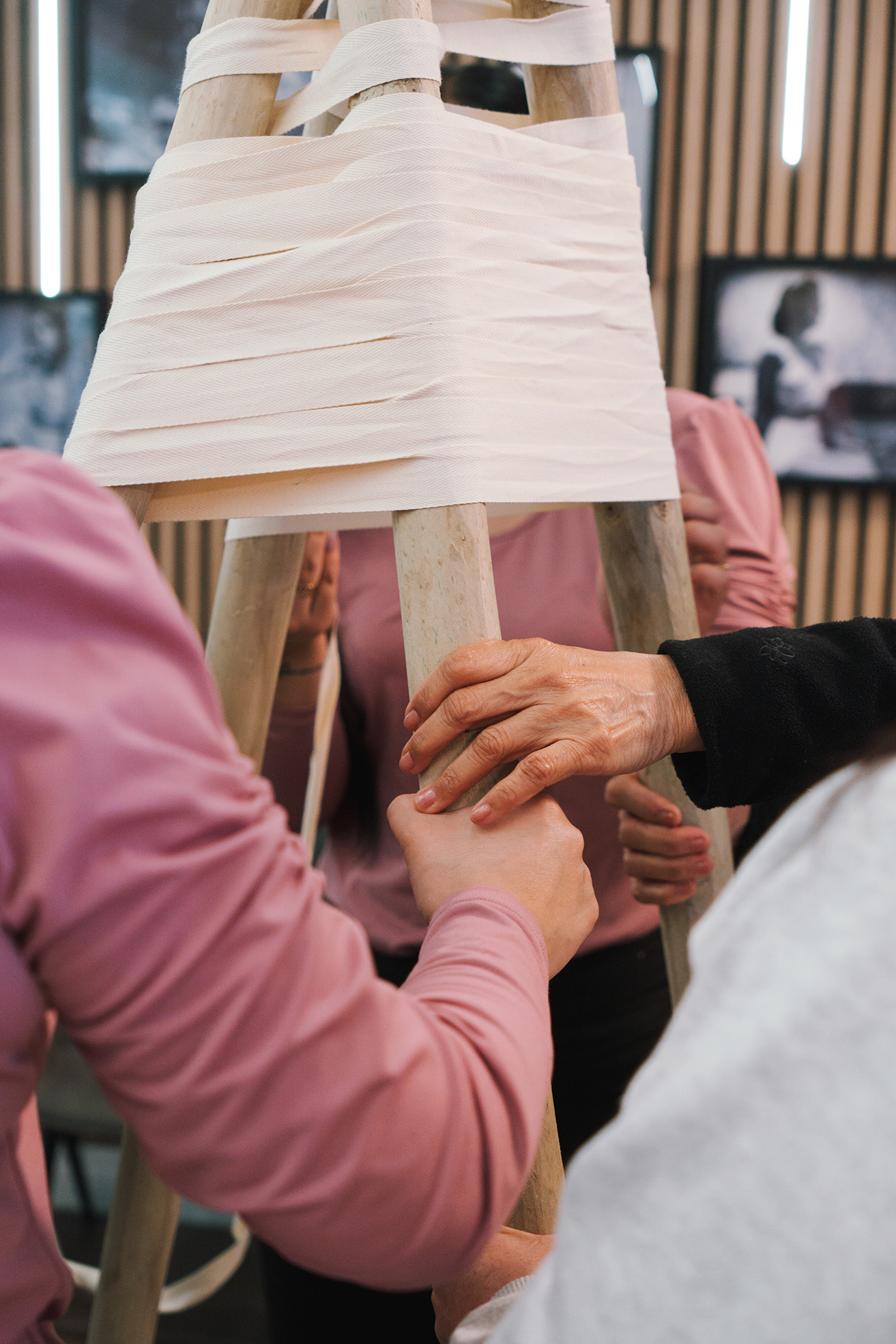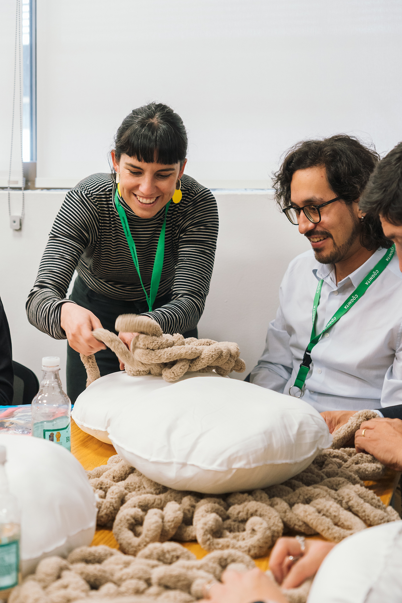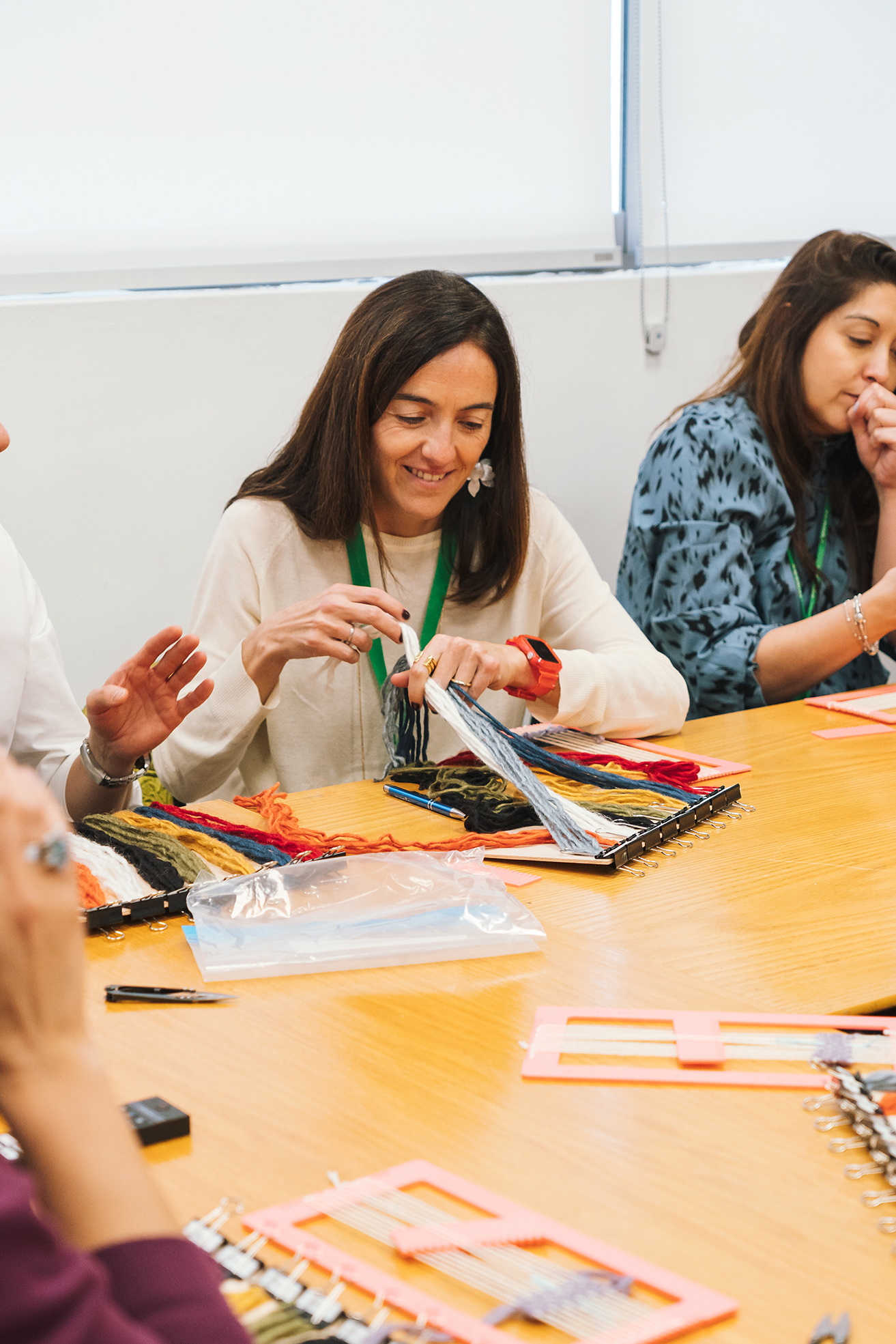 Estas intervenciones están centradas en la gestión emocional, la comunicación consciente y el fortalecimiento de vínculos. A través de dinámicas corporales, conversaciones guiadas y actividades creativas con textiles, las intervenciones abren espacios de pausa, escucha y conexión, invitando a las personas a relacionarse de manera más humana y colaborativa dentro de sus organizaciones.