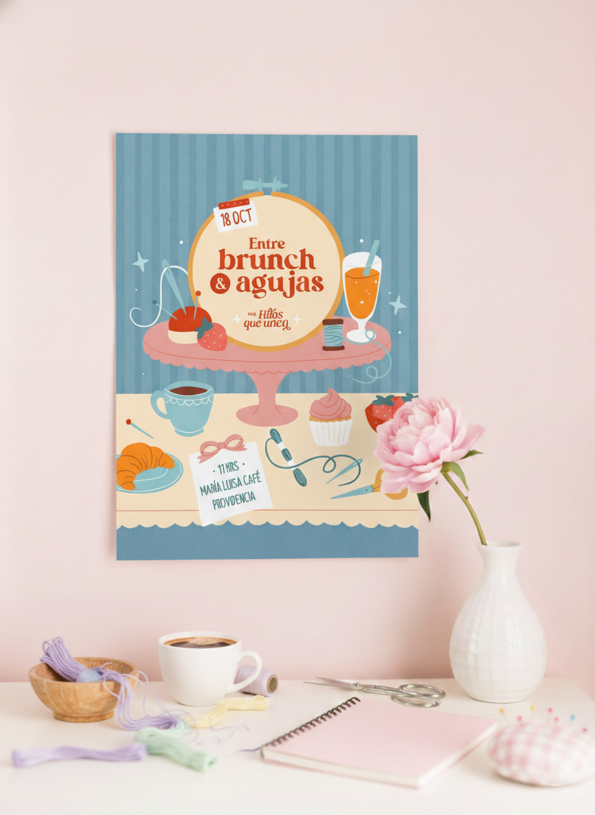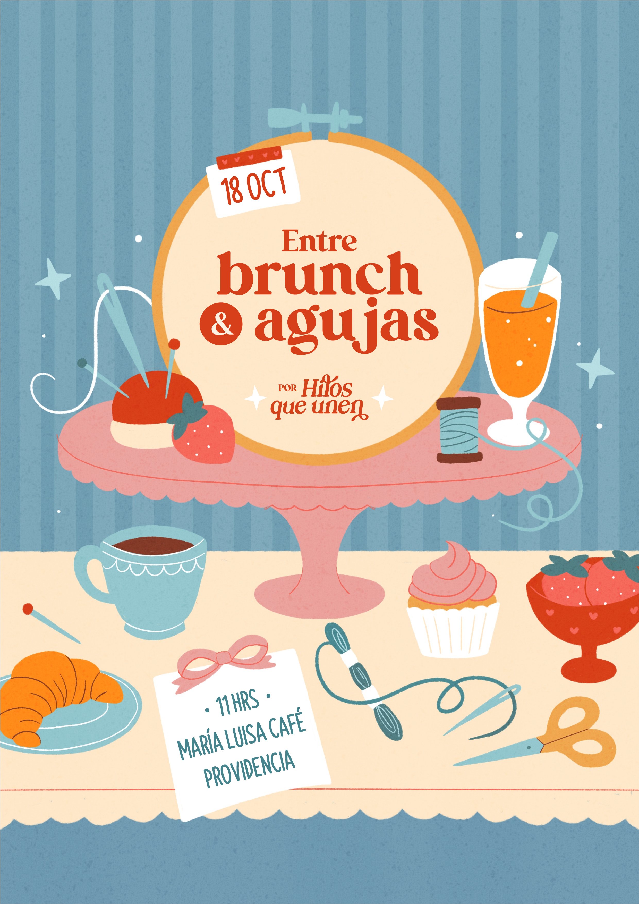 Diseñé la gráfica del afiche y la ilustración a bordar para el evento “Entre brunch y agujas”, una experiencia de la comunidad del bordado de Hilos que Unen.