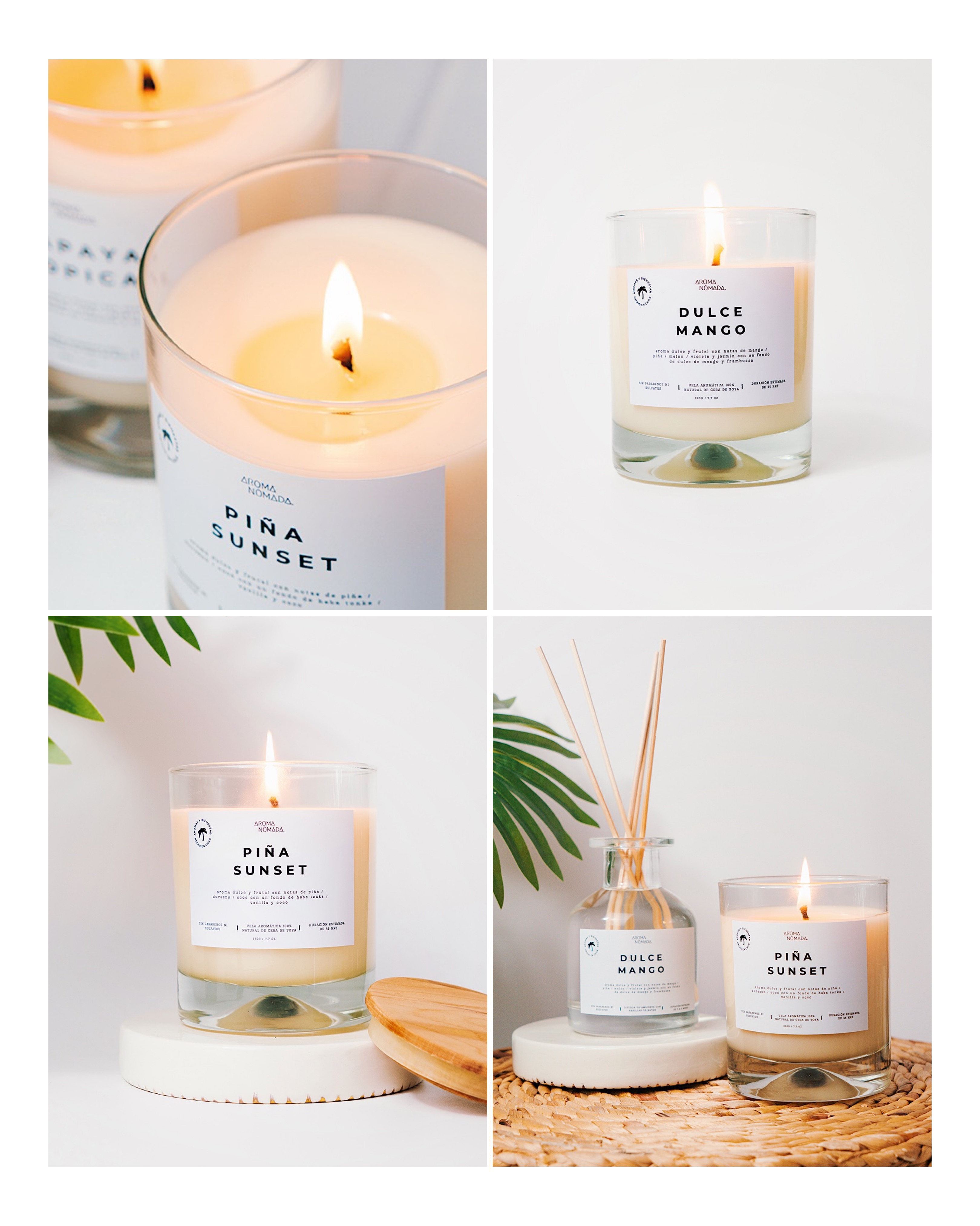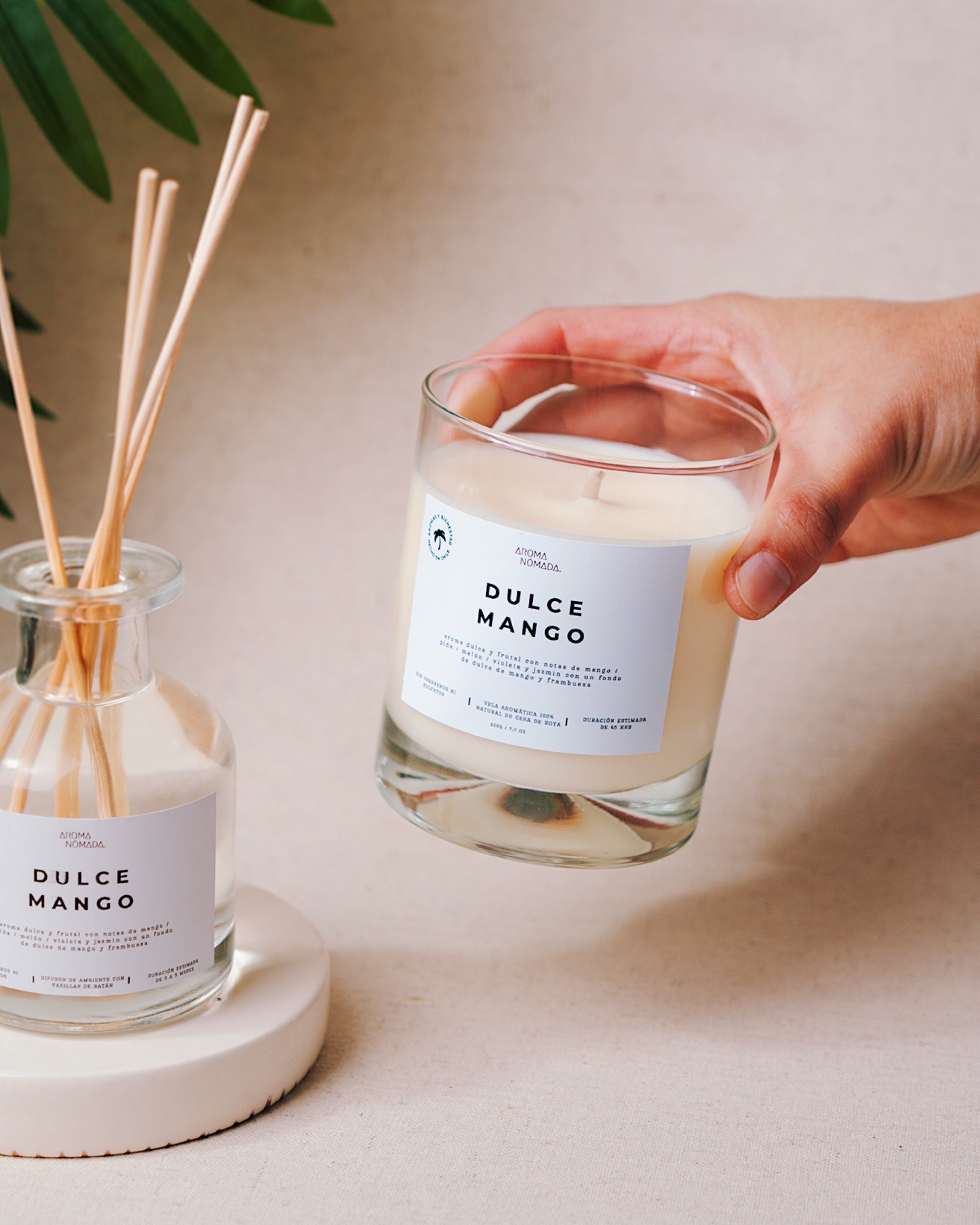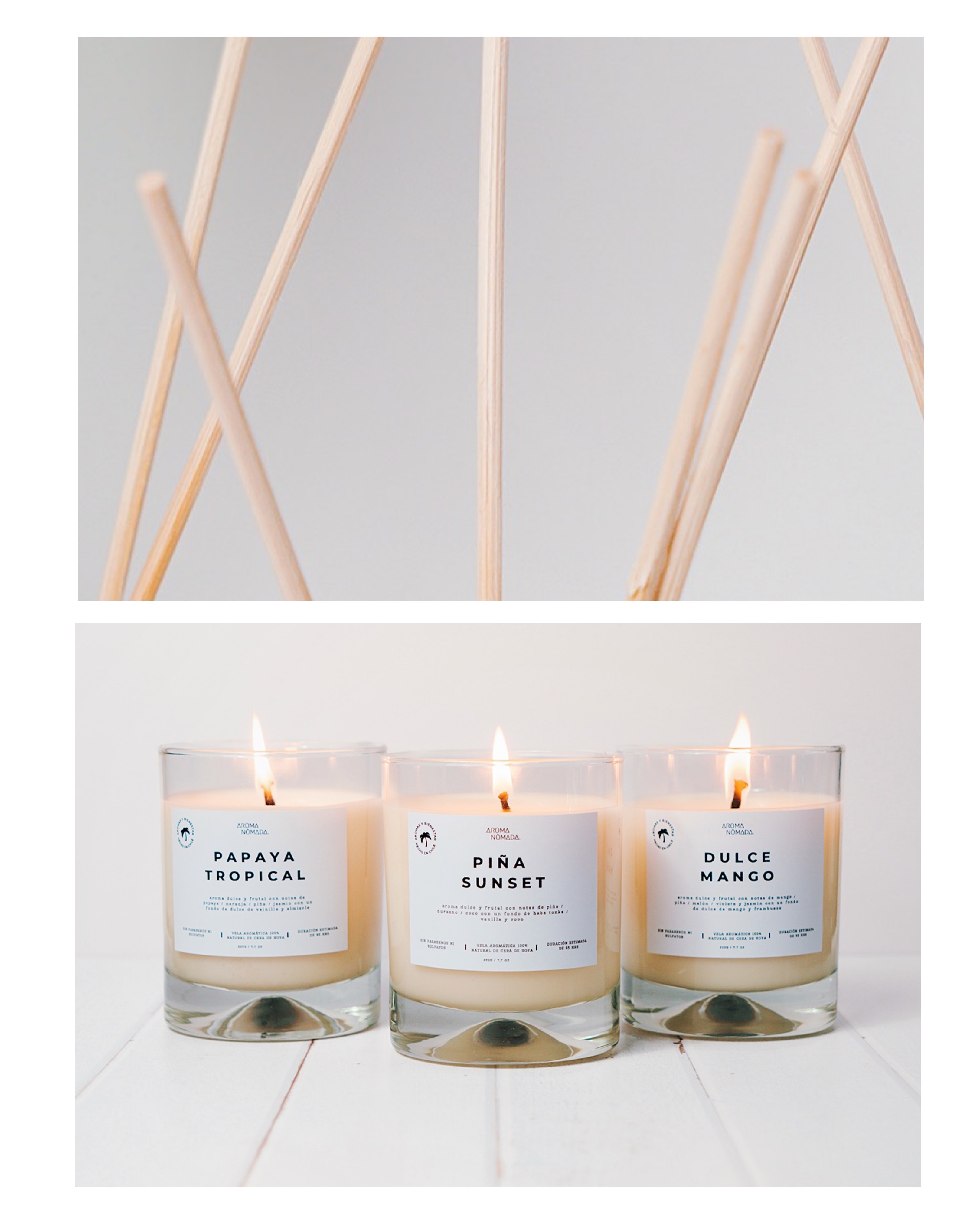 Fotografía de productos para la web de Aroma Nómada, marca chilena de velas y aromatizadores artesanales. Las imágenes exploran una estética minimalista que busca transmitir calma y una identidad inspirada en aromas tropicales y un espíritu libre de vibra playera.