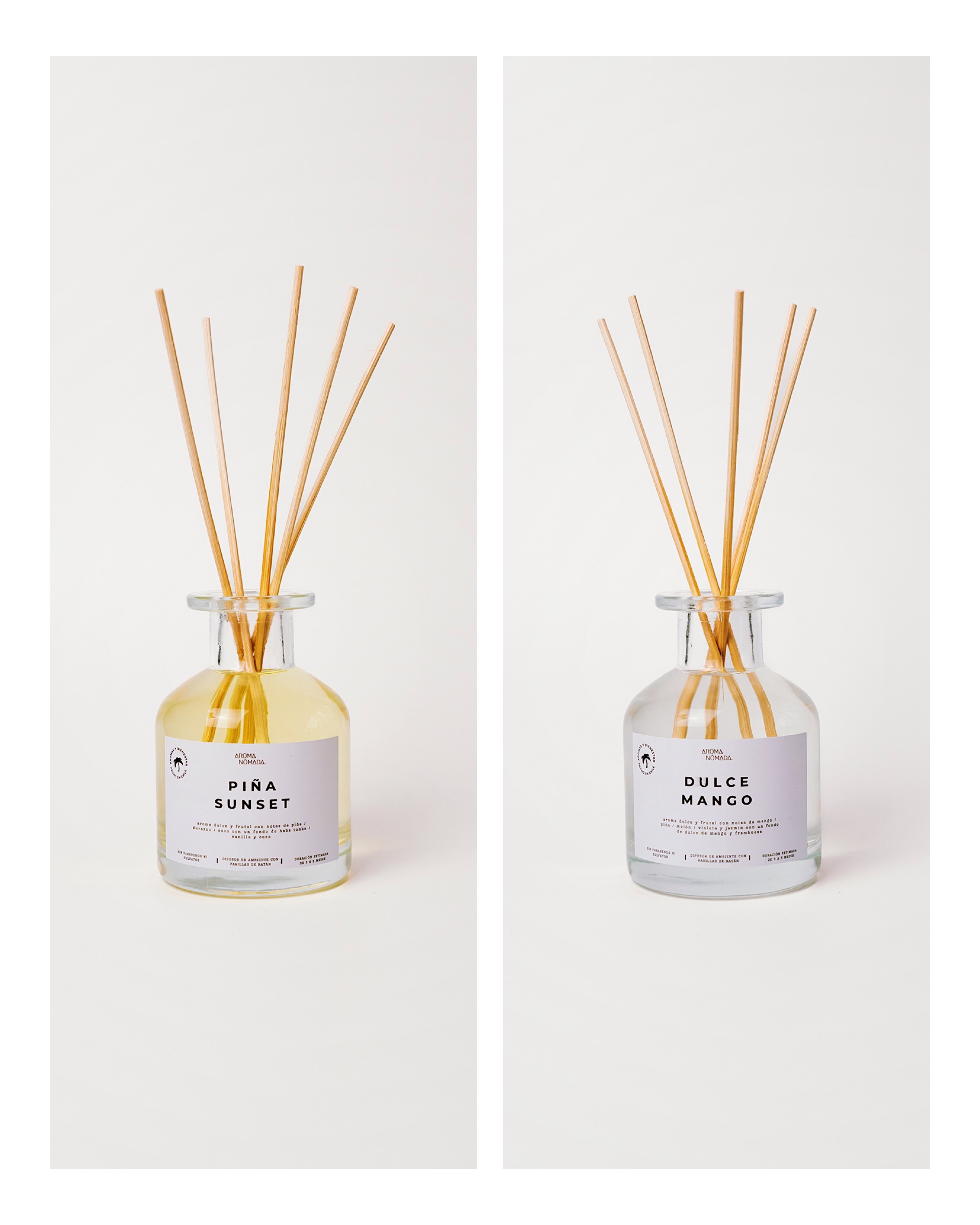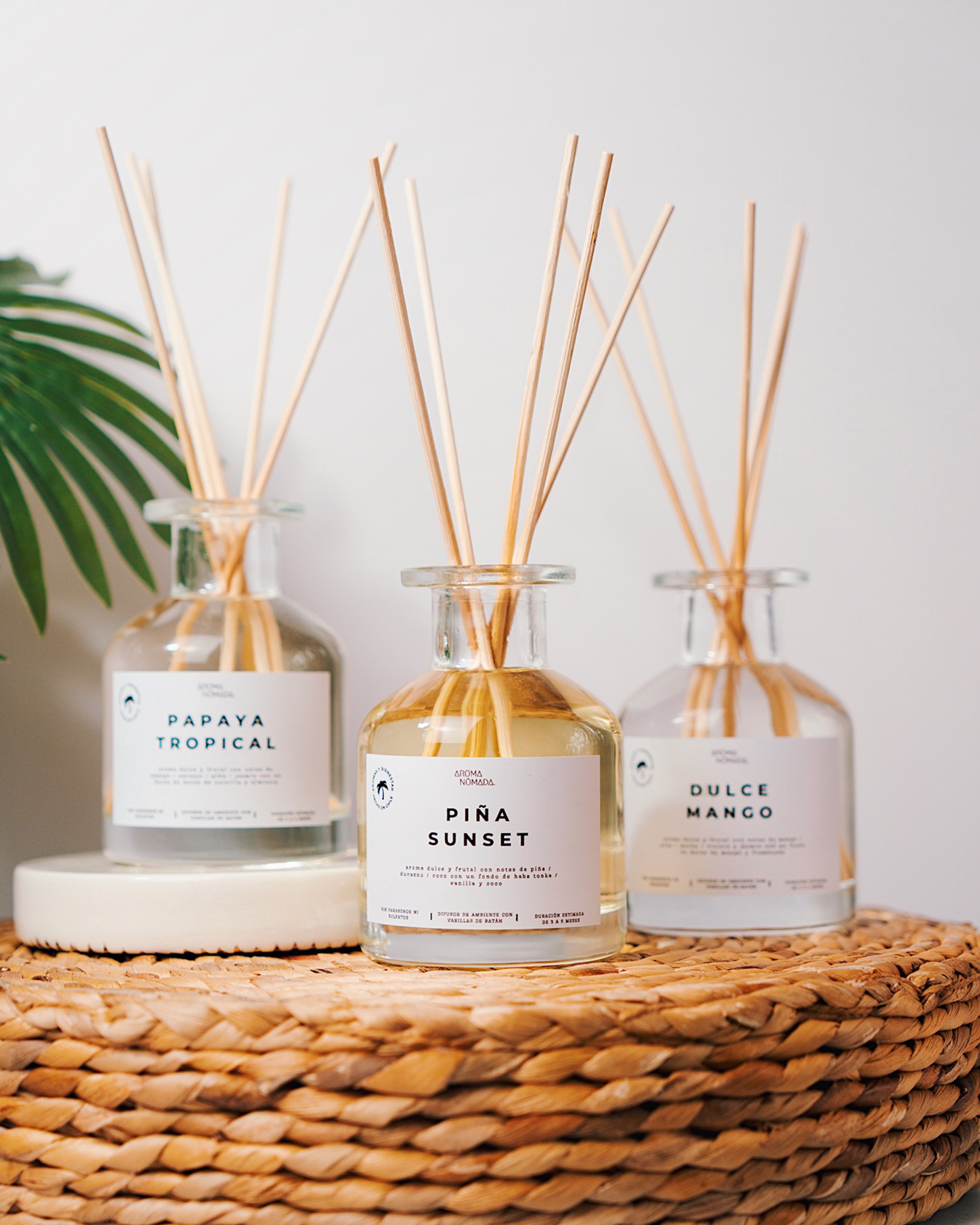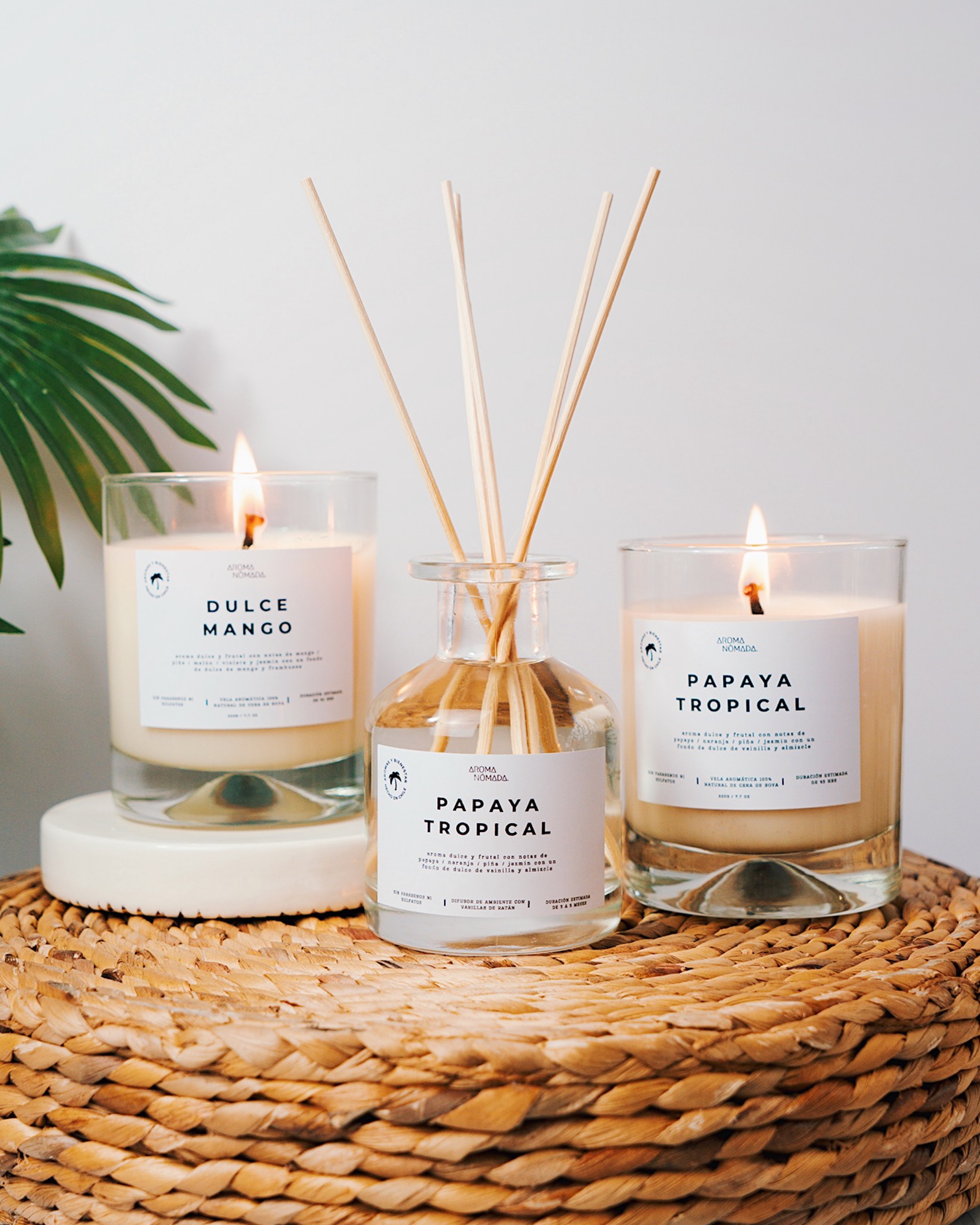 Fotografía de productos para la web de Aroma Nómada, marca chilena de velas y aromatizadores artesanales. Las imágenes exploran una estética minimalista que busca transmitir calma y una identidad inspirada en aromas tropicales y un espíritu libre de vibra playera.